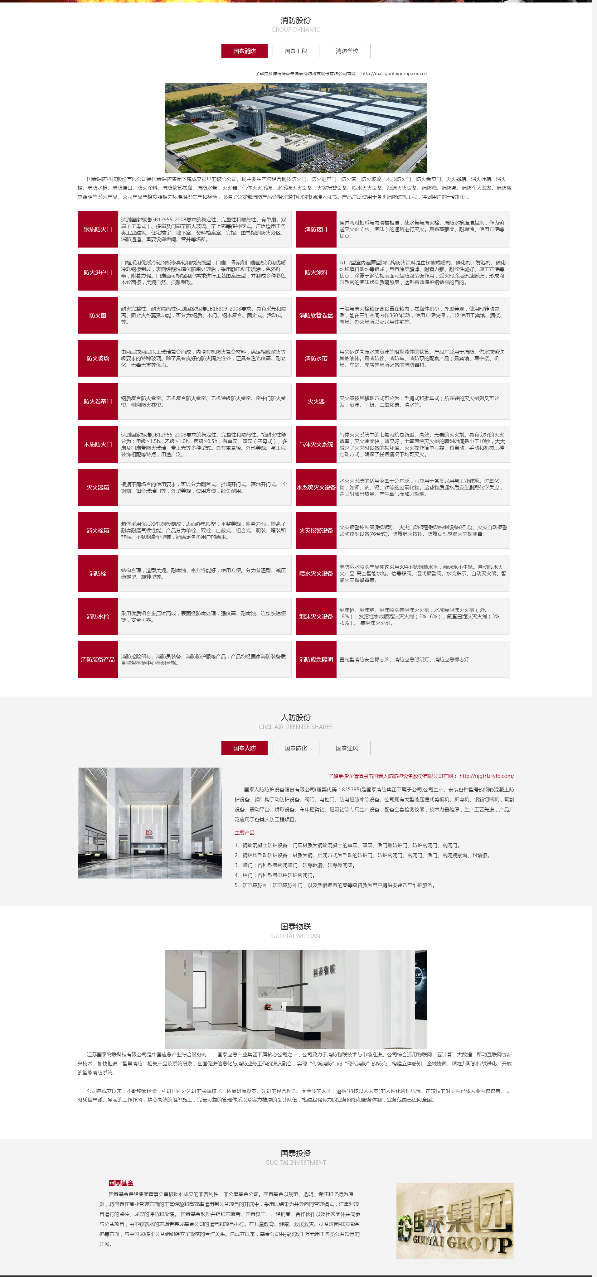 國泰應(yīng)急集團(tuán)創(chuàng)建于1999年,總部位于中國(南京)軟件谷國泰應(yīng)急大廈,是一家致力于打造以消防為核心的中國應(yīng)急安全產(chǎn)業(yè)綜合服務(wù)商,集消防、人防(掛牌上市)、安防、投資四大產(chǎn)業(yè)于一體。中國消防器材制造業(yè)10強(qiáng)企業(yè),中國消防行業(yè)十大民族企業(yè),國家人防辦定點(diǎn)生產(chǎn)企業(yè),消防產(chǎn)品國家實(shí)驗(yàn)室單位,擁有國家住建部頒發(fā)的消防設(shè)施工程設(shè)計(jì)甲級(jí)、施工一級(jí)資質(zhì),擁有應(yīng)急管理部頒發(fā)的消防設(shè)施維保、檢測(cè)、評(píng)估國家一級(jí)資質(zhì),具有國家城市市政工程、建筑工程、裝飾工程等各項(xiàng)專業(yè)承包資質(zhì)。集團(tuán)現(xiàn)有員工3000余人,擁有華東、華北、華西、華南四大產(chǎn)業(yè)園基地,及1000余家下屬分、子公司。