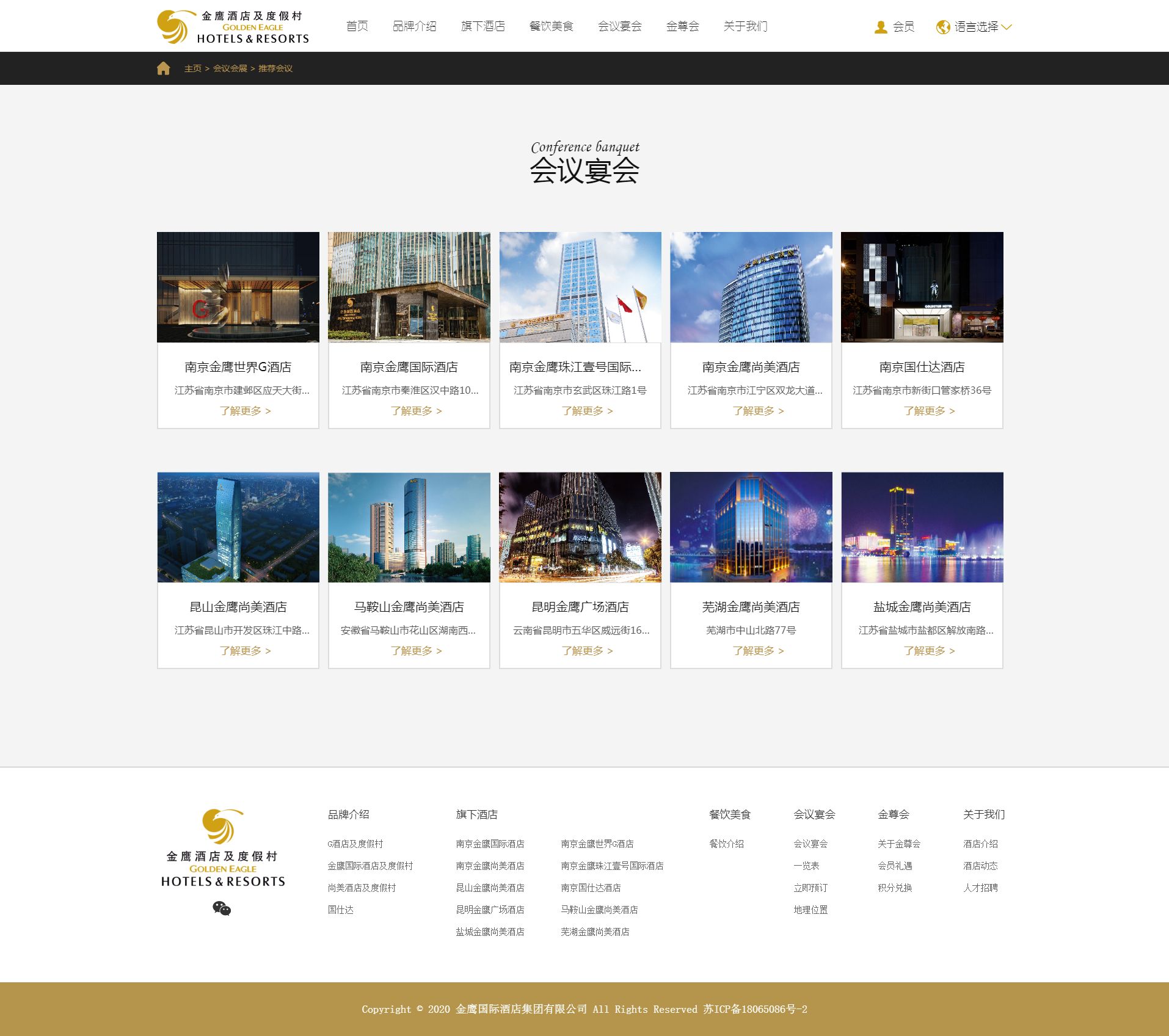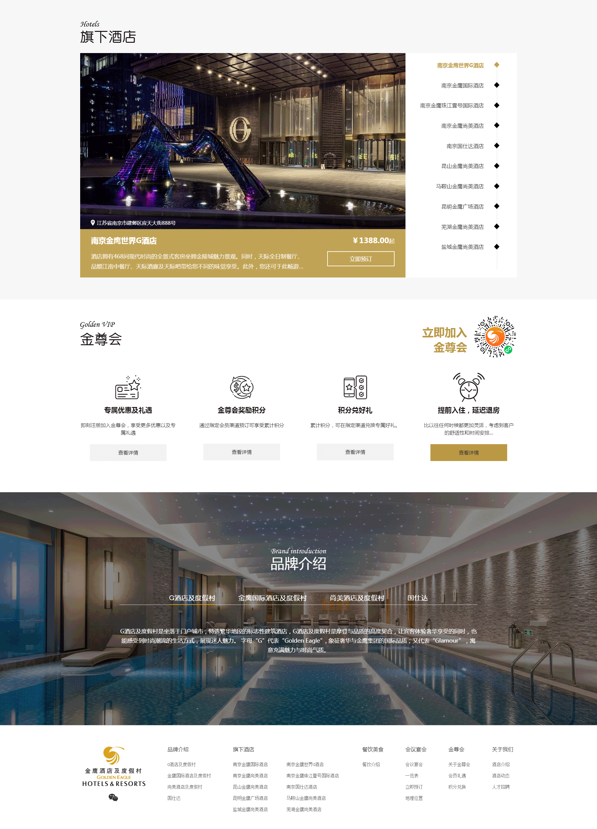 金鷹酒店及度假村管理集團創建于2006年,是金鷹國際集團旗下從事酒店運營、管理及關聯服務的業務板塊。我們擁有專屬的忠誠客戶計劃「金尊會」以及定位奢華的「G酒店及度假村」、定位豪華的「金鷹國際酒店及度假村」、定位商務的「尚美酒店及度假村」和定位生活方式類的「國仕達」等多個酒店及度假村品牌。金鷹酒店及度假村集團管理的10家酒店分布于江蘇省、安徽省、云南省等區域內的6座門戶型城市,未來還將在大中華區的多個地域樞紐型城市繁華地段籌備開業多家奢華和豪華型酒店。
